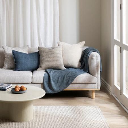 Handwoven in 100% linen, the Arcadia Cushion features a 1cm flange edge, enhancing strength and durability while creating an easy and contemporary aesthetic. The muted, steel blue tone and lumbar shape makes this the perfect finishing piece for a pared-back, thoughtfully crafted interior.