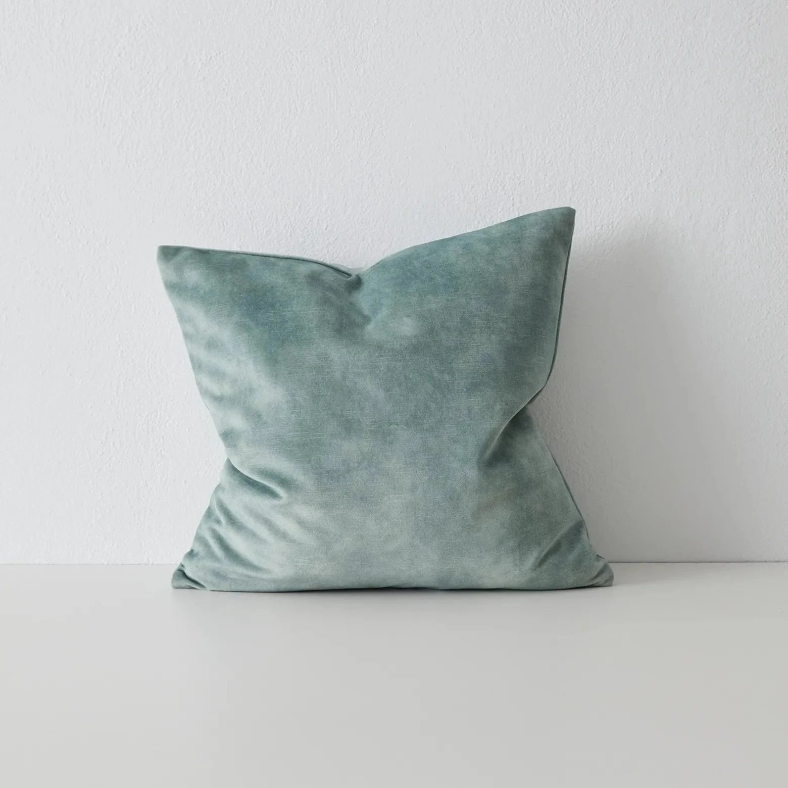 In a neutral, cool-toned setting, Ava Seaglass brings a soft, aqua tone. Its gorgeous, rich, velvet-like texture makes this cushion a bestseller, and most loved.
