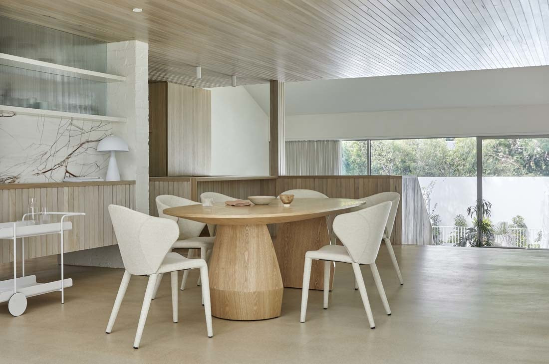 Commanding interest through striking forms and a bold symmetrical base, the Bloom Dining Table features a oval top, inviting connectivity in matt dark oak or natural ash.