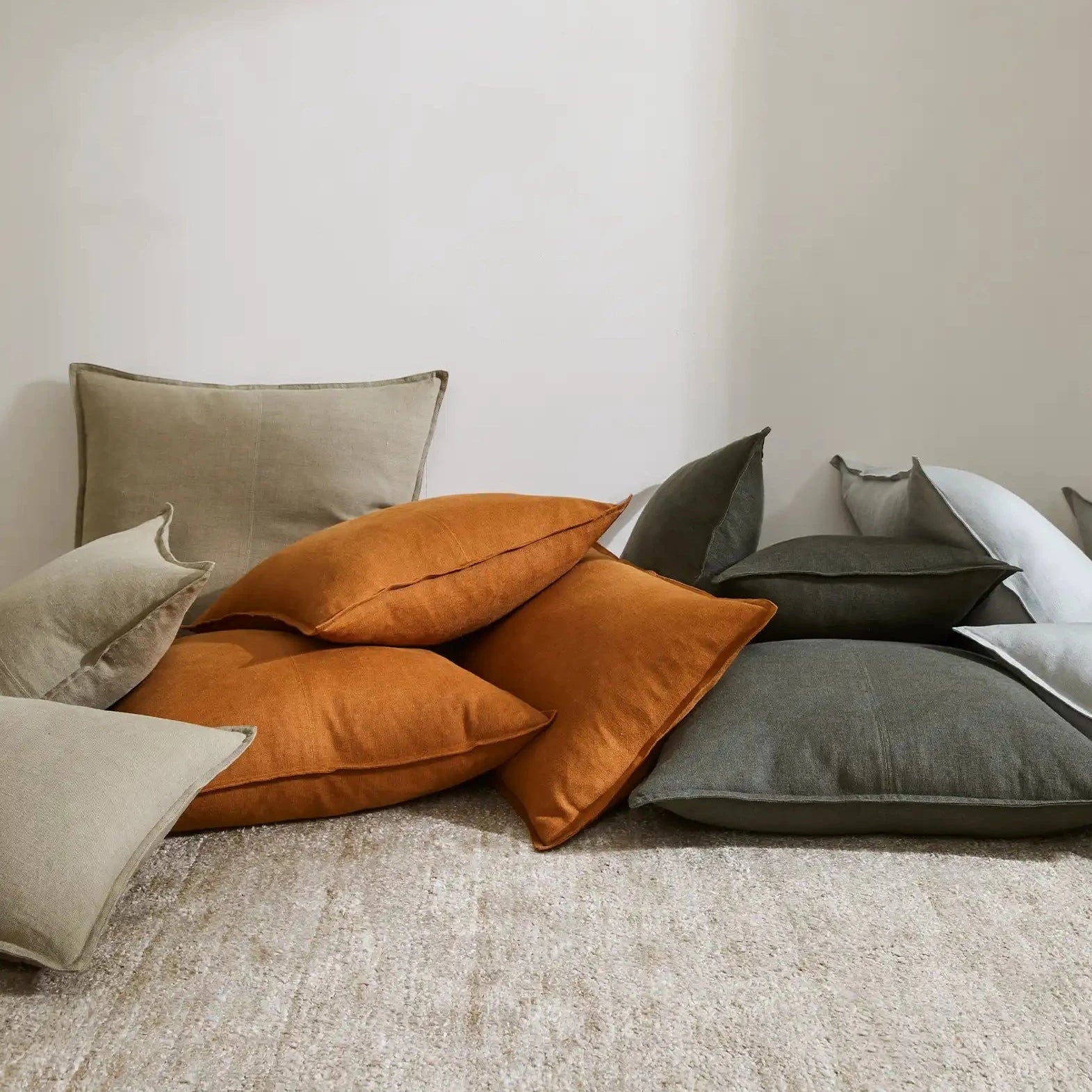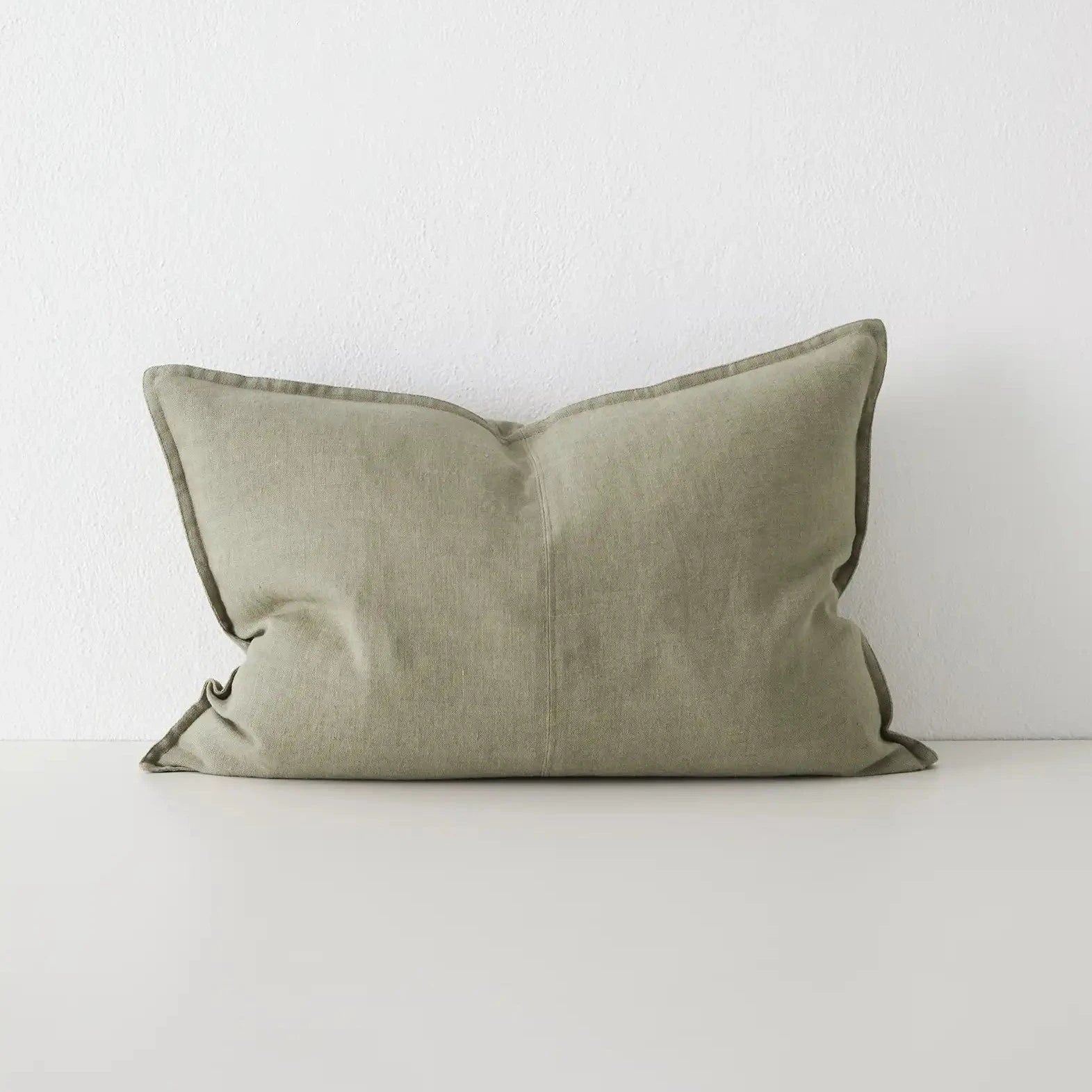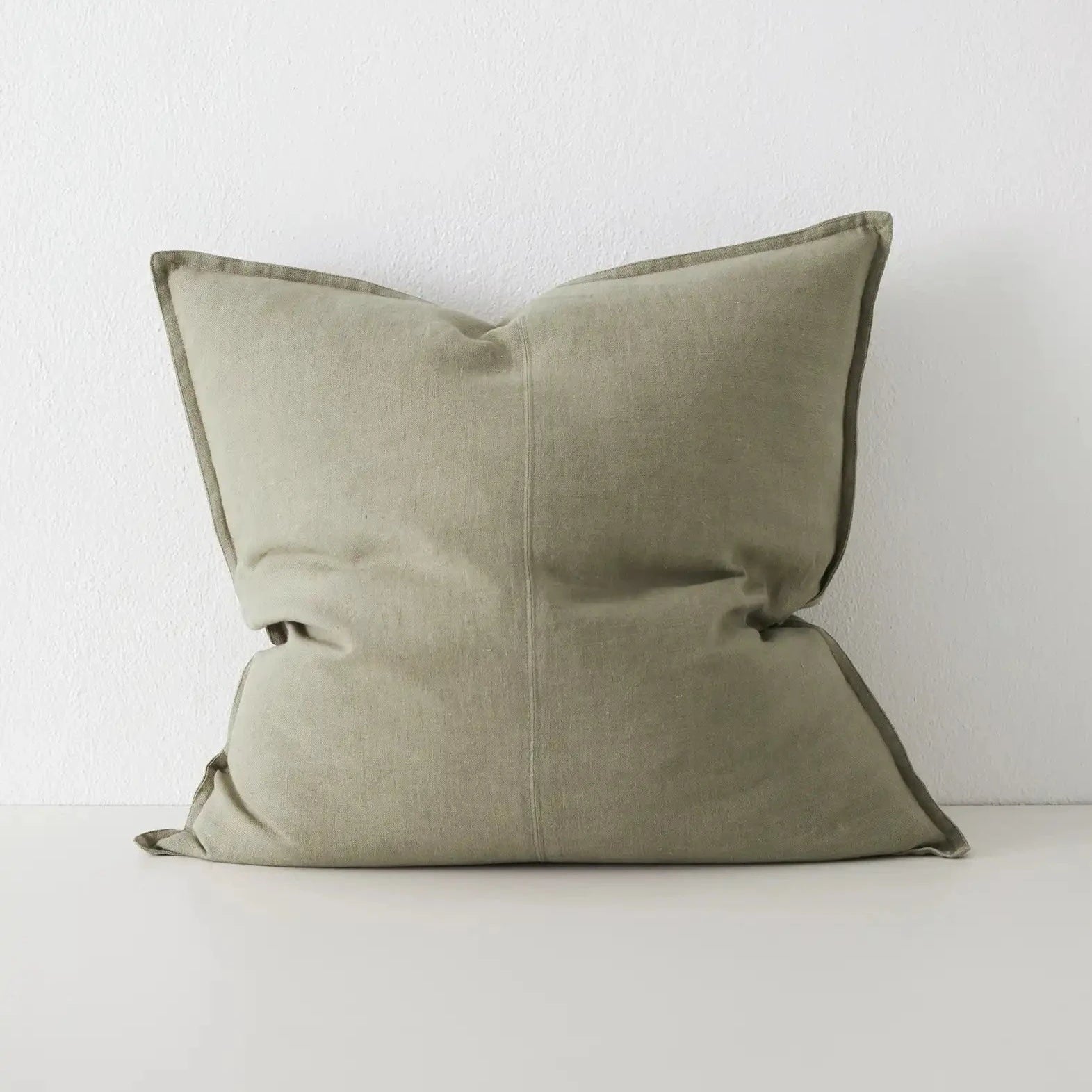 Como Caper is a soft, muted green ideal for neutral, green, or spice themes. This premium linen cushion is stylishly finished with a double stitch French seam edge and panel detail.