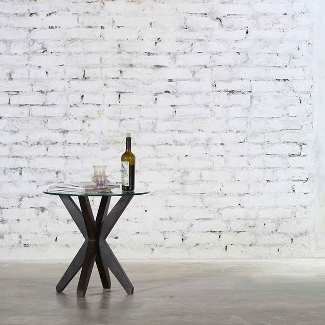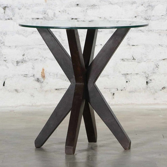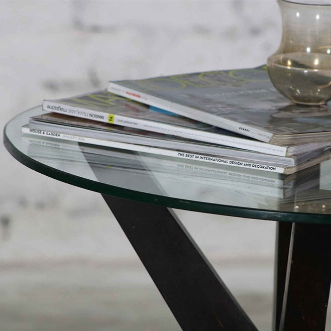 Cyrus side table in Mango Wood with black wash finish, and glass top. Also available with a natural Leg.