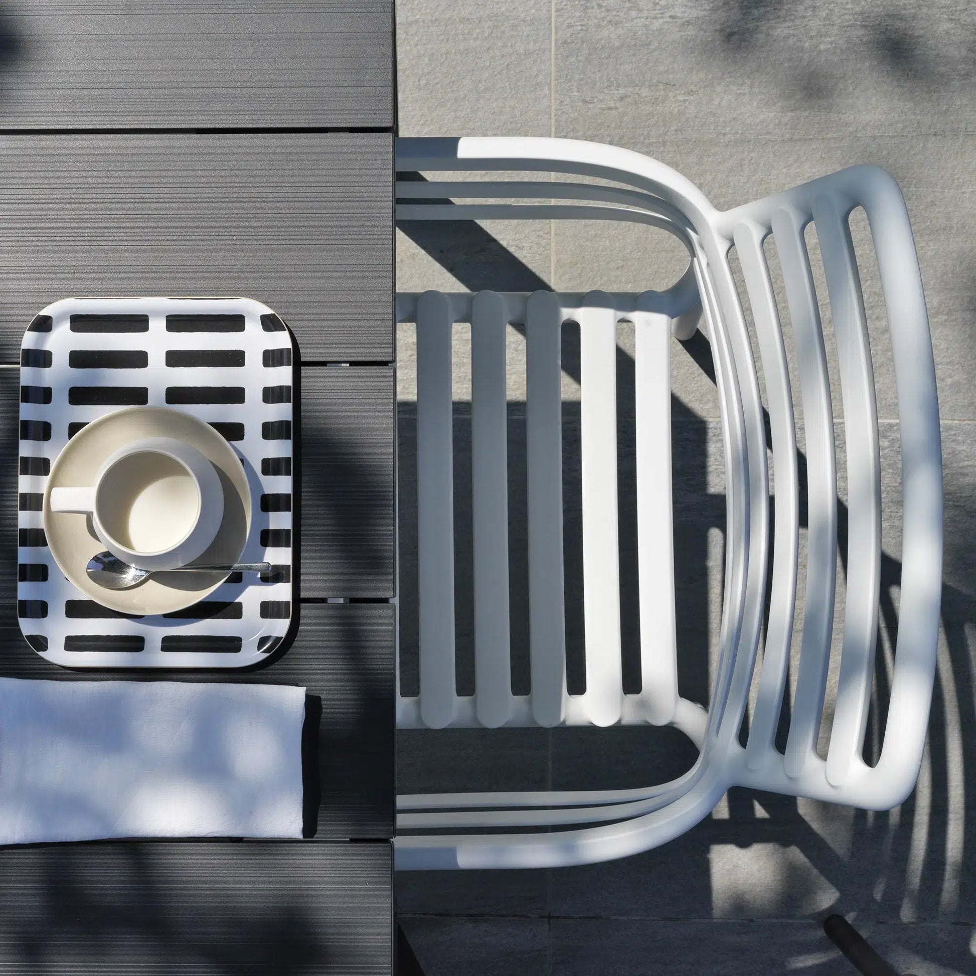 The Doga Outdoor Dining/Armchair showcases a simple, elegant design that’s contemporary and linear with minimal curves. The slatted seat and back give the chair a breezy look, and cast playful shadows underneath.