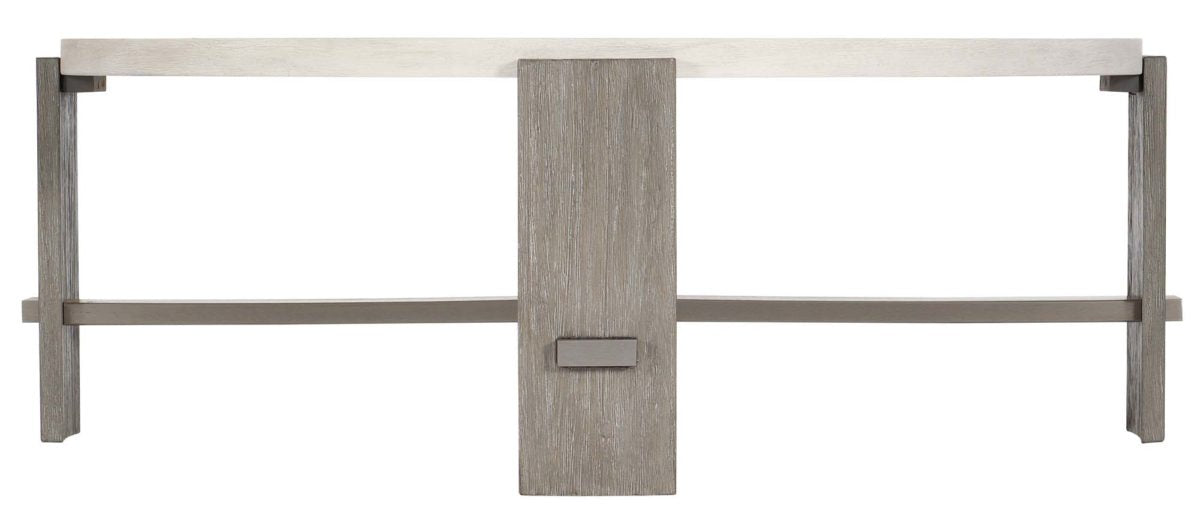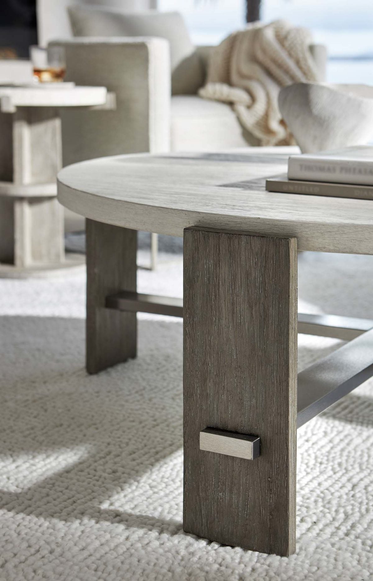Foundations is a refined expression of modern rustic, defined by a minimalist style and relaxed comfort. The Foundations cocktail table features clean lines and an elegant profile. Crafted from contrasting light and dark wire-brushed acacia, its round top rests on rectangular legs joined by a matching stretcher. Smart and sophisticated, this piece is the perfect complement to a modern or traditional interior.