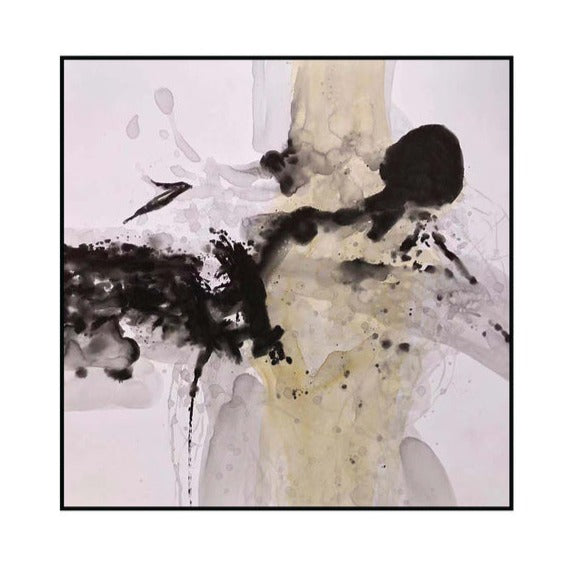 Dashes of black wash over light layers of grey and gold of the Gian Painting, it's dark focal points will subtly transform a lounge, kitchen or dining room - it comes finished with a thin black frame.