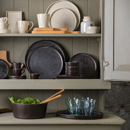 The pure geometrical shape and variegated metallic glaze gives the Lagoa dinnerware collection a genuine look of hand-thrown ceramics, combined with all the advantages of high-fired culinary stoneware. The decorative dark bronze glaze of Lagoa illuminates like nothing else, and food becomes the absolute focus, as it should!