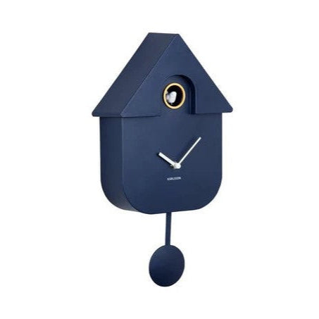 Introducing the Modern Cuckoo Clock in sleek dark blue. With ABS construction and an open face design, this magical clock's features include a delicate swinging pendulum, bird song, and the option to turn off the cuckoo sound between 10pm and 6am.