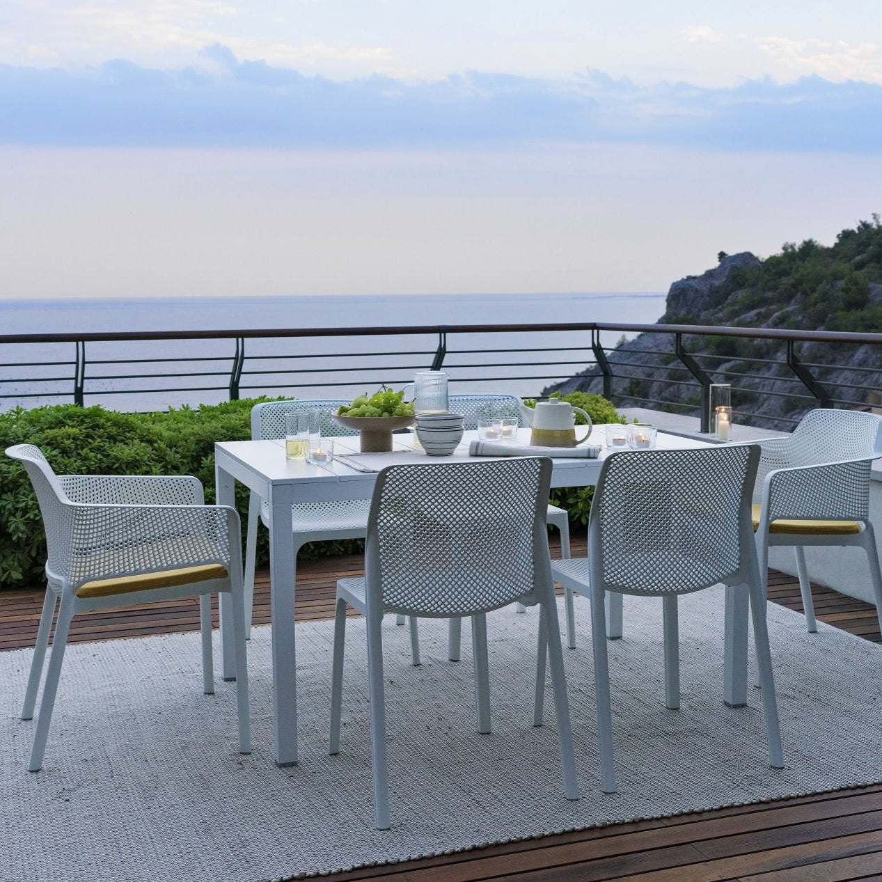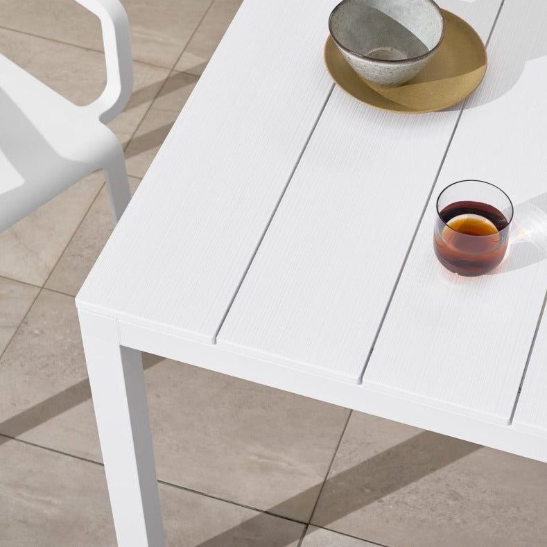 The Rio Table pays respect to wooden options that came before it, featuring a tabletop design inspired by timber slats. The Rio Aluminium 1400 to 2100 extension table is ultra-low maintenance and requires only mild soap solution and a wet cloth to clean.