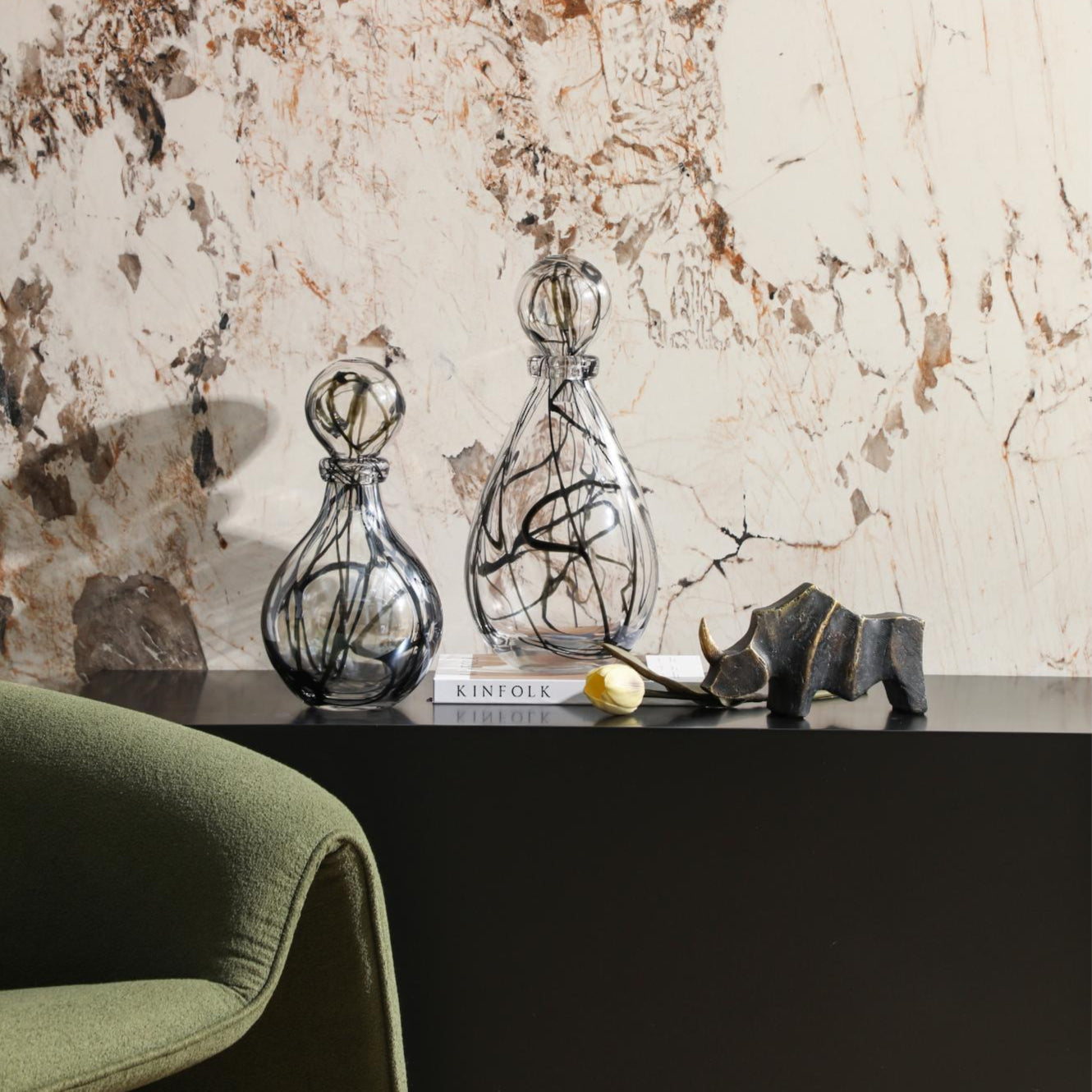 The small Swirl Decanter is expertly crafted from high-quality glass, featuring an intricate black pattern that adds a sophisticated touch to any setting.