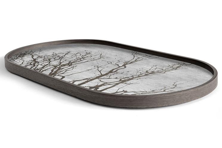 This large oblong wooden tray experiments with the balance between rich patterns offset with muted tones, revealing the beauty behind the deceivingly ordinary subjects from which inspiration is drawn. This tray captures the essence of timelessness.