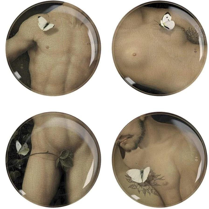 These 4 plates, all different, can be used to complete the Yuan Eden set or can be used separately to set a surprising table and enhance the appeal of a meal. Side by side, they feature a bucolic table runner marked by immortal statues, antique beauties of a forgotten park where nature gradually reasserts itself
